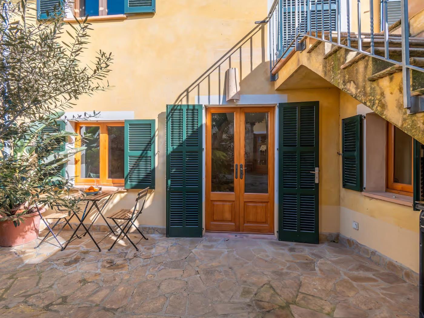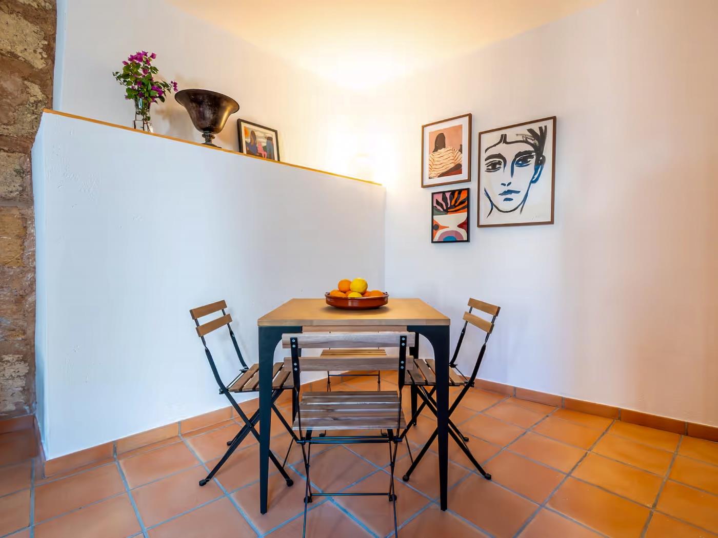 La casa cuenta con un patio privado con sombra natural, una terraza soleada y un comedor exterior, perfectos para relajarse al aire libre, disfrutar de desayunos mediterráneos o cenas tranquilas. En el interior encontrarás un salón acogedor, una cocina totalmente equipada y 2 dormitorios dobles, además de un baño completo con todas las comodidades necesarias. Uno de los dormitorios ofrece acceso independiente desde la terraza, lo que aporta un extra de privacidad dentro de la propiedad.